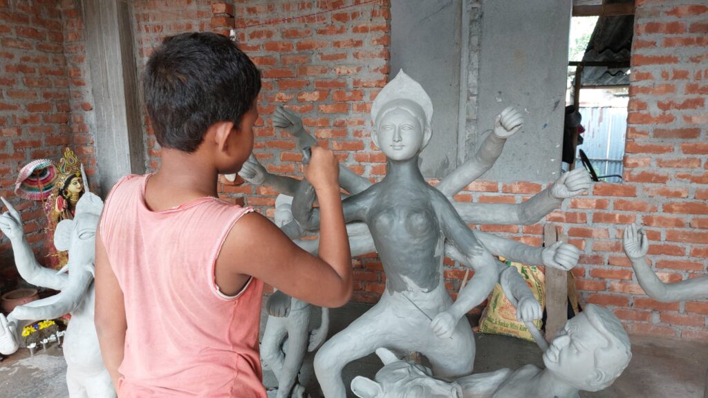 In the meantime, Durga Puja was never practiced at his home. However, in an effort to encourage the youngster with his enthusiasm for idol-making, the festival has been held at his house with his handcrafted idols for the past three years. With only a few days ahead of pujas, Sanjit is working hard on creating decorative idols for the festival besides his schooling.