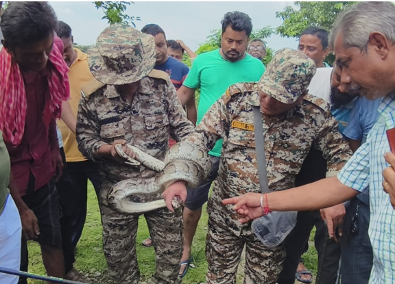 Bagdogra, 15th July: An eight feet long python was rescued from a tree near the Bagdogra Airport More by the forest department. As per reports, the local residents of the area spotted the snake hidden in a bird’s nest on a tree today. Subsequently, the rescue team of the Bagdogra Forest Department was immediately informed and the python was recovered. Additionally, the forest department stated that the snake will be released deep into the forest.