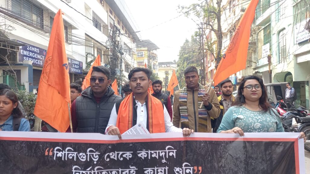 Siliguri, 09 February: The members of Akhil Bharatiya Vidyarthi Parishad (ABVP) of the Siliguri Organizational District took to the streets demanding cancellation of the job of the school teacher involved in the minor student sexual assault case.