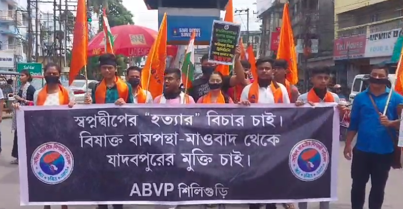 Siliguri, 16th August: The Siliguri branch of the Akhil Bharatiya Vidyarthi Parishad (ABVP) staged a protest at Hashmi Chowk (Venus More) in Siliguri demanding justice for the ragging-related death of a student in Jadavpur University.