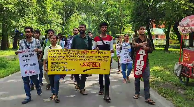 Siliguri, 14th August: Following the tragic passing of Swapnadeep Kundu, a first-year student at Jadavpur University, the state’s educational landscape has been engulfed in turmoil. The All India Democratic Students’ Organisation (AIDSO) led a rally today, culminating in a sit-in protest at Gate No. 2 of North Bengal University. Their demands encompass a thorough and expeditious investigation into Swapnadeep Kundu’s demise, stringent punitive actions against the perpetrators, improved security measures, the establishment of a fair and democratic atmosphere within all university campuses and hostels across the state.