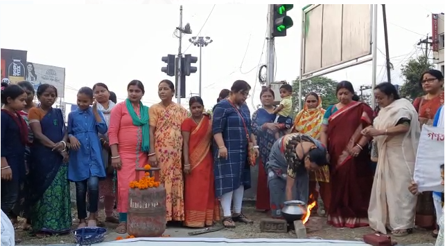 Members of AIDWA today protested against the hike in the price of domestic gas at Mahatma Gandhi More. Today, the protesters garlanded the gas cylinder and also cooked food on the stove.