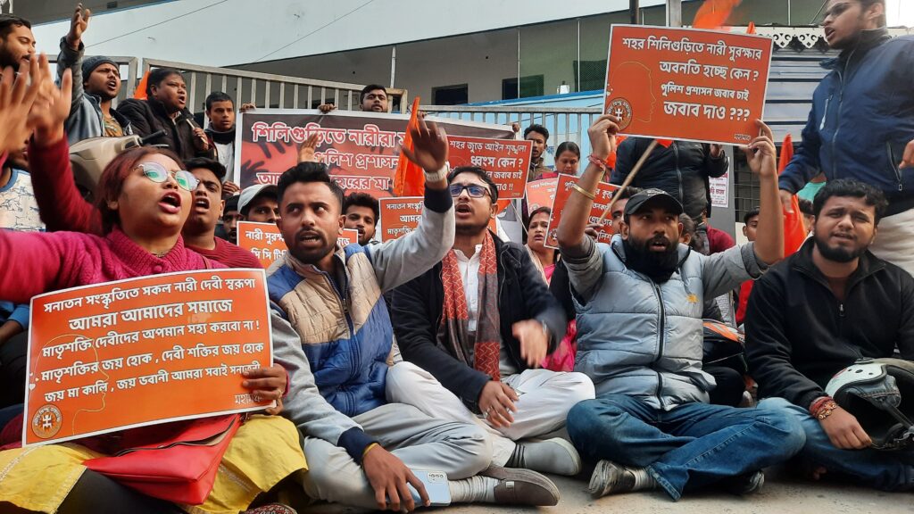 Siliguri, 19th January: On Friday, the Bangiya Hindu Mahamancha staged a sit-in protest in front of the Siliguri police station and handed over a memorandum demanding women’s protection across the city.