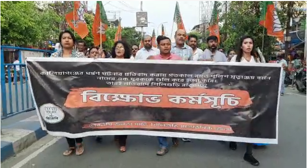 Siliguri, 27th April: The Bharatiya Janata Party (BJP) organized a protest rally in Siliguri to voice their concerns over the recent death of a party worker in Kaliyaganj. The rally was led by party leaders and workers from the Siliguri organizational district, which commenced from Hashmi Chowk in Siliguri. The route of the rally covered Hill Cart Road and Sevoke More, before returning to the starting point at Hashmi Chowk.