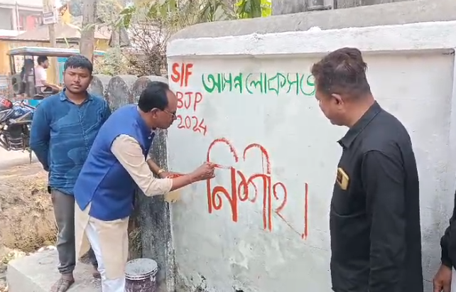 Cooch Behar, 03rd March: The Bharatiya Janata Party (BJP) launched a wall-writing campaign shortly after the announcement of the name of Cooch Behar MP and MoS Nisith Pramanik for the Cooch Behar Lok Sabha constituency. Nikhil Ranjan Dey, BJP MLA from Dakshin Cooch Behar Assembly Constituency, as well as other BJP leaders and supporters, attended the program in Cooch Behar’s Ward No. 1.