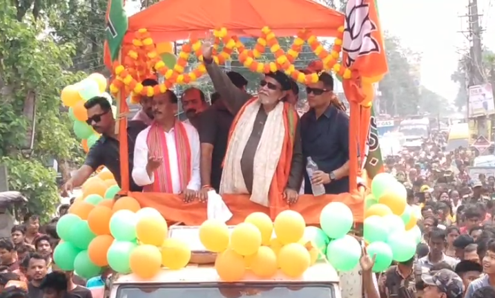 Cooch Behar, 16th April: Bharatiya Janata Party (BJP) leader and actor Mithun Chakraborty led a roadshow and public rally in Pundibari of Cooch Behar in support of candidate Nisith Pramanik from the Cooch Behar Lok Sabha constituency.