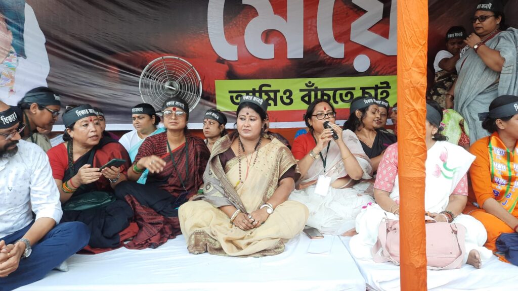 Siliguri, 07th August: Bharatiya Janata Party (BJP) Mahila Morcha of Siliguri district organized a two-day sit-in protest at Hashmi Chowk (Venus More) in Siliguri to denounce the escalating incidents of rape, murder, and abuse of women across West Bengal.