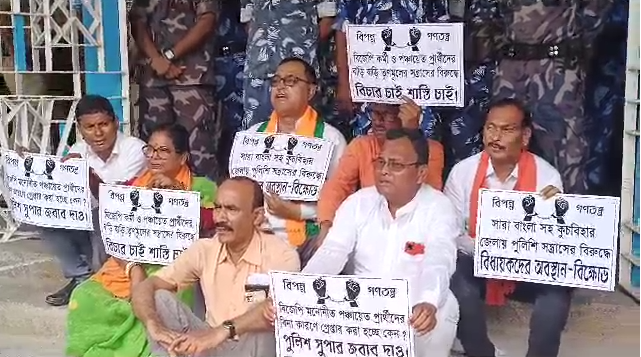 Cooch Behar, 30th June: Bharatiya Janata Party (BJP) leaders and Members of the Legislative Assembly (MLAs) organized a protest demonstration in front of the District Superintendent of Police (SP) office in Cooch Behar on Friday. The protest was staged in response to alleged intimidation of BJP workers throughout the district and the purported unjust arrest of a BJP candidate.