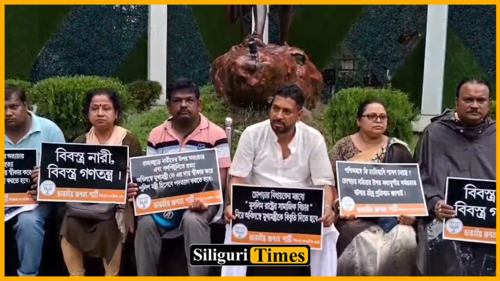 Siliguri, 01st July: The Siliguri Organizational District of the Bharatiya Janata Party (BJP) staged a protest on Monday adjacent to the Gandhi statue at Court More, condemning the recent violence in Islampur, Cooch Behar, and Chopra. BJP leaders, including MLA Shankar Ghosh, participated in the demonstration.