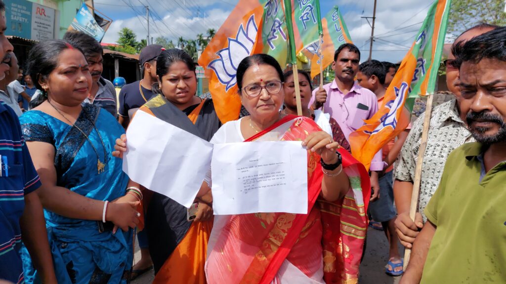 Siliguri, 20th September: The Bharatiya Janata Party (BJP) activists once again joined the blockade demanding the repair of the dilapidated Baribhasa VIP Road. The road blockade was led by Fulbari-Dabgram BJP MLA, Shikha Chatterjee.
