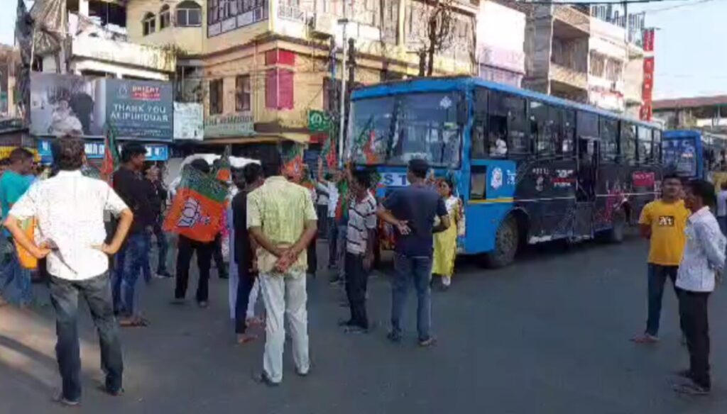 A notable incident occurred when a group of BJP workers blocked a North Bengal State Transport Corporation (NBSTC) bus traveling from Siliguri to Dhubri. The blockade took place at Alipurduar More, where party members halted the government vehicle in the presence of law enforcement.