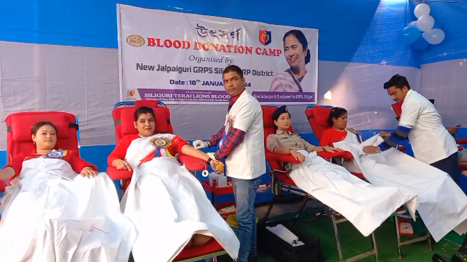 Siliguri, 10th January: On Wednesday, a blood donation camp was organized at the New Jalpaiguri (NJP) railway station under the ‘Utsarg Yojana’. The camp was organized under the initiative of New Jalpaiguri GRPS, Siliguri GRP District, in collaboration with Siliguri Terai Lions Blood Bank.