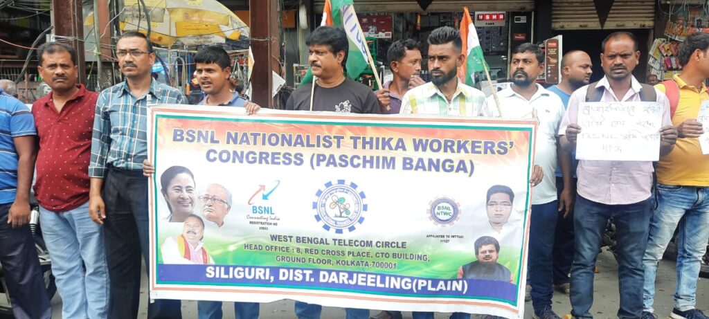 Siliguri, 01st May: The employees of Bharat Sanchar Nigam Limited Nationalist Thika Workers’ Congress (Paschim Banga) protested at Hashmi Chowk in Siliguri to support their demands, including opposing retrenchment. Reportedly, last month, 1,350 employees were retrenched across West Bengal, even after working on a contract basis for 20 years in BSNL. Among them were 250 employees from Siliguri, Darjeeling, and Kalimpong.