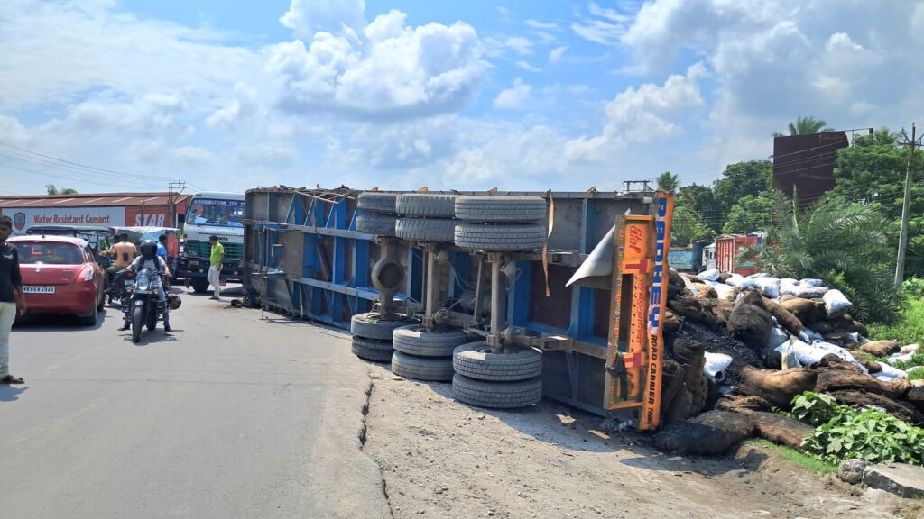 Fulbari, 19th August: A coal-laden trailer lost control and overturned on the Siliguri-Jalpaiguri National Highway early Monday morning. The incident occurred around 6 a.m. near the Jotiakali More in Fulbari, leading to severe traffic congestion on the highway.