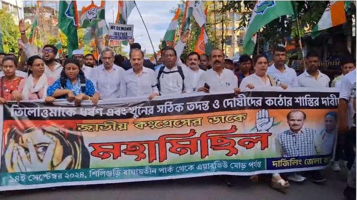 Siliguri, 14th September: In response to the R.G. Kar incident, the Darjeeling District Congress organized a massive rally in Siliguri on Saturday demanding strict punishment for those responsible. The rally, led by state Congress President Adhir Ranjan Chowdhury, commenced from Baghajatin Park and traversed various parts of the city before concluding at Air View More.