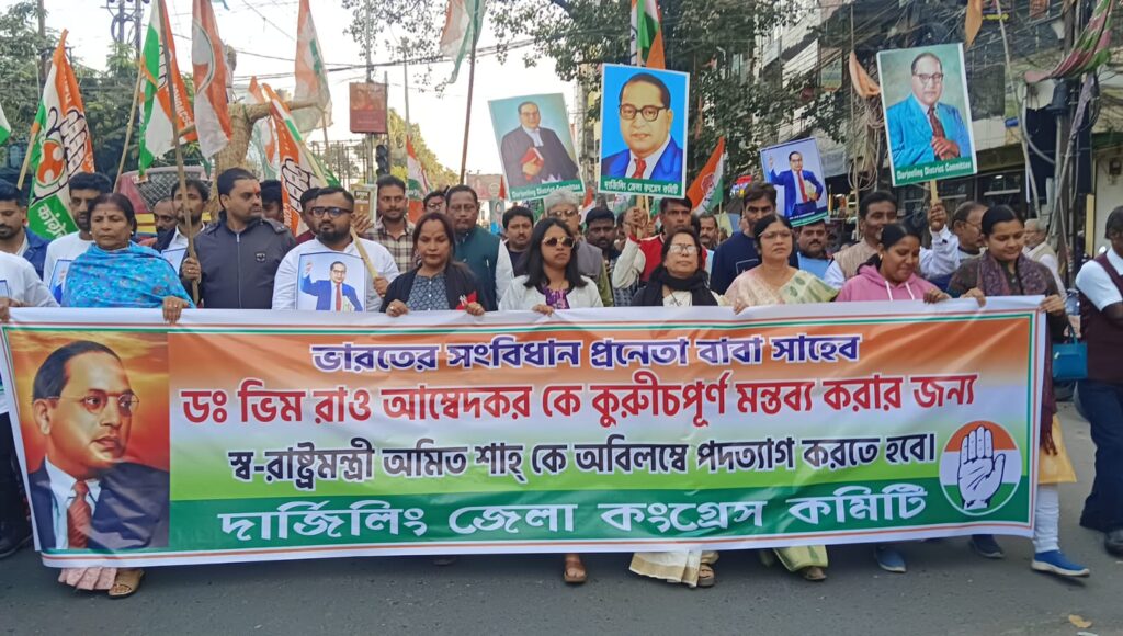 Siliguri, 24th December: The Darjeeling District Congress organized a protest march in Siliguri, demanding the resignation of Union Home Minister Amit Shah over his alleged controversial remark about Dr. B. R. Ambedkar.