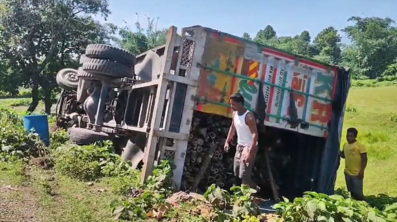 Kharibari, 12th September: A container truck carrying bamboo overturned into a roadside trench after losing control due to poor road conditions. The incident occurred on National Highway 327 in the Balaijhora area of Batasi in Kharibari.