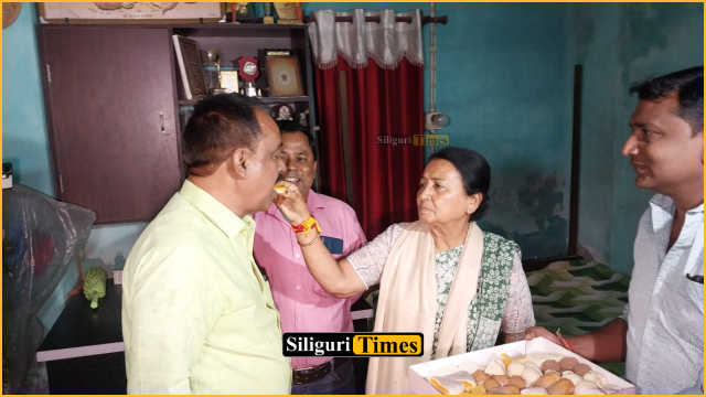 Siliguri, 19th March: TMC candidate Ranjan Sil Sharma visited the residence of BJP candidate Sikha Chatterjee in Dabgram–Fulbari on Thursday morning with flowers and sweets.