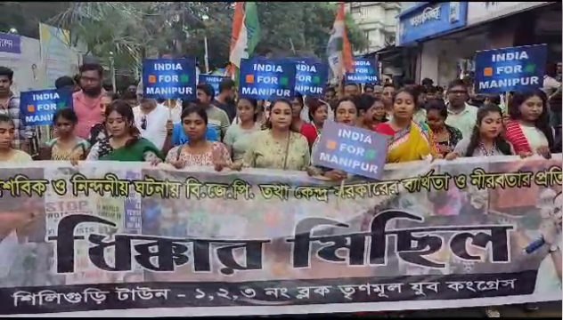 Siliguri, 27th July: In response to the Manipur incident, the Darjeeling District Trinamool Youth Congress organized a protest rally in Siliguri. The rally commenced today from Baghajatin Park in Siliguri and traversed various parts of the city before concluding at Airview More. The event saw the participation of workers from Siliguri Town Block No. 01, 02, and 03 Trinamool Youth Congress, as well as the presence of Papiya Ghosh, the leader of Darjeeling District Trinamool Sabha.