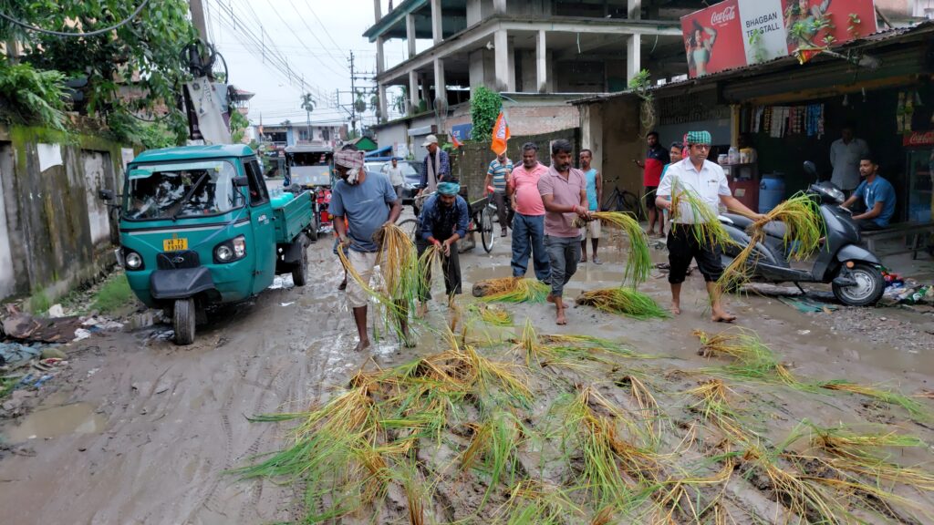 Siliguri, 22nd August: The Pokai Jote locality within Ward No. 46 under Siliguri Municipal Corporation (SMC) has fallen into a state of disrepair. To draw attention to this issue, the Mandal Committee-I of the Bharatiya Janata Party (BJP) organized a protest by symbolically planting paddy saplings as a demand for immediate road restoration.