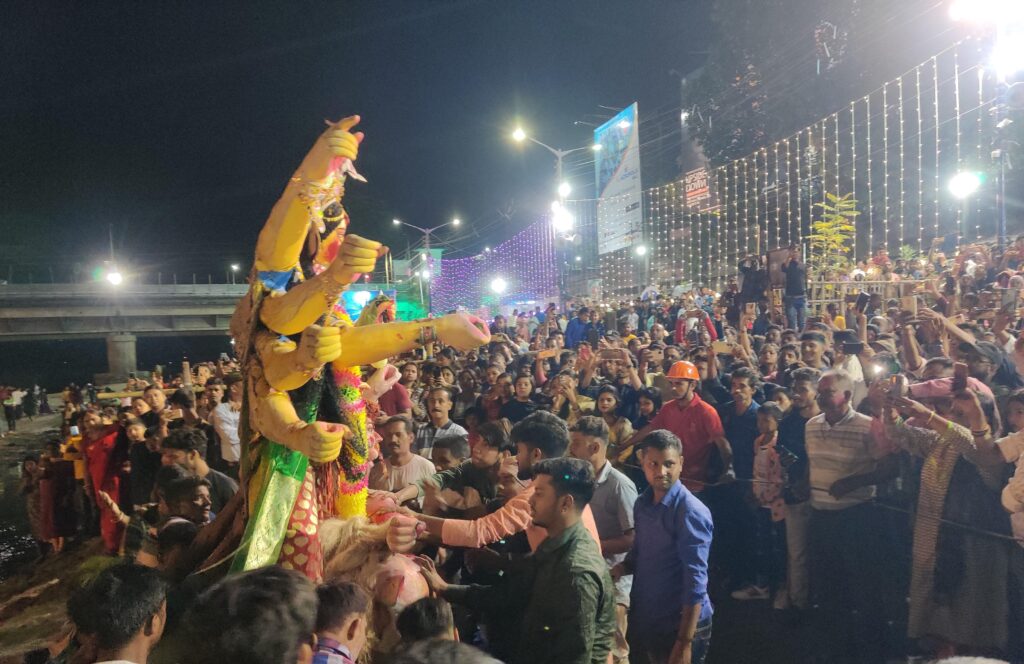 Siliguri, 25th October: On Tuesday, the idol immersion ceremony of Goddess Durga commenced in Siliguri and continued till the following morning at various river ghats of the city. Notably, a maximum number of the idols were immersed at Lal Mohan Moulik Niranjan Ghat. During this, a large crowd of people arrived to witness the Visarjan.