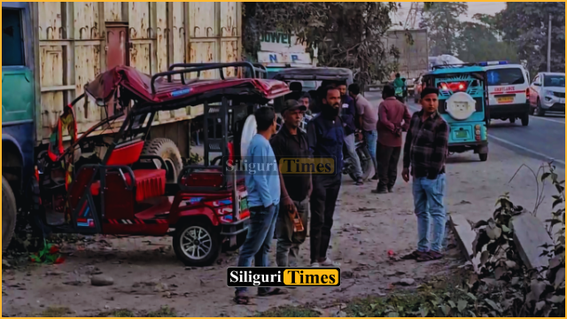 Fulbari, 11th December: Three people were injured after a collision between an e-rickshaw and a goods vehicle on Thursday afternoon at Amaidighi area along the Siliguri-Jalpaiguri National Highway in Fulbari.