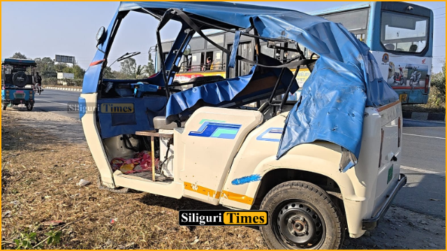 Rajganj, 21st February: A collision occurred on the Siliguri-Jalpaiguri National Highway on Saturday between an e-rickshaw and a small goods vehicle, leaving the e-rickshaw driver seriously injured. The accident took place near Panikauri More in Rajganj.