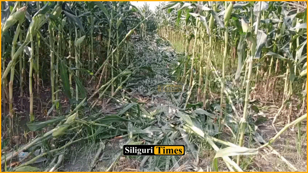 Alipurduar, 16th April: A herd of elephants wreaked havoc on several bighas of farmland in the Paschim Madarihat area under the Madarihat block of Alipurduar district. Reports indicate that approximately four bighas of maize and paddy fields were destroyed in the attack.