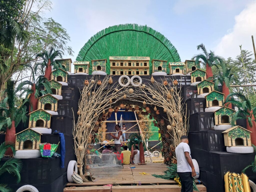 Situated in Panikauri Gram Panchayat of Rajganj Block, Navodaya Sangha has been hosting a grand Kali Puja celebration for several years. This year marks their 50th anniversary, a golden jubilee, with the chosen theme, ‘Pakhir Desha Maa,’ designed to revive memories of rural birdlife. The puja mandap has been decorated with various materials, including jute sticks, clay, and straw, crafted into artistic representations.