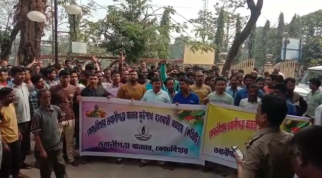 Cooch Behar, 31st January: The footpath traders protested in front of the Cooch Behar District Magistrate’s office regarding the tax increase. A rally was taken out on Tuesday by the Cooch Behar Bhawaniganj Market Footpath Byabasayee Samanwaya Committee. The traders joined the strike and submitted a memorandum to the District Magistrate.