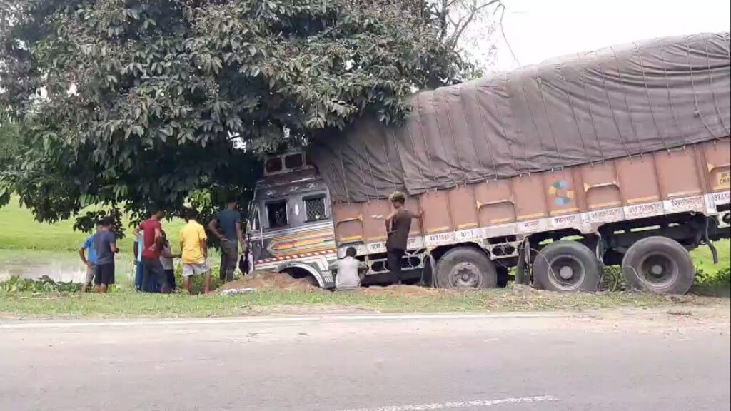 Kharibari, 25th July: A freight truck veered off the road and plunged towards a reservoir in the Balaijhora area near the National Highway-327, adjacent to Kharibari.