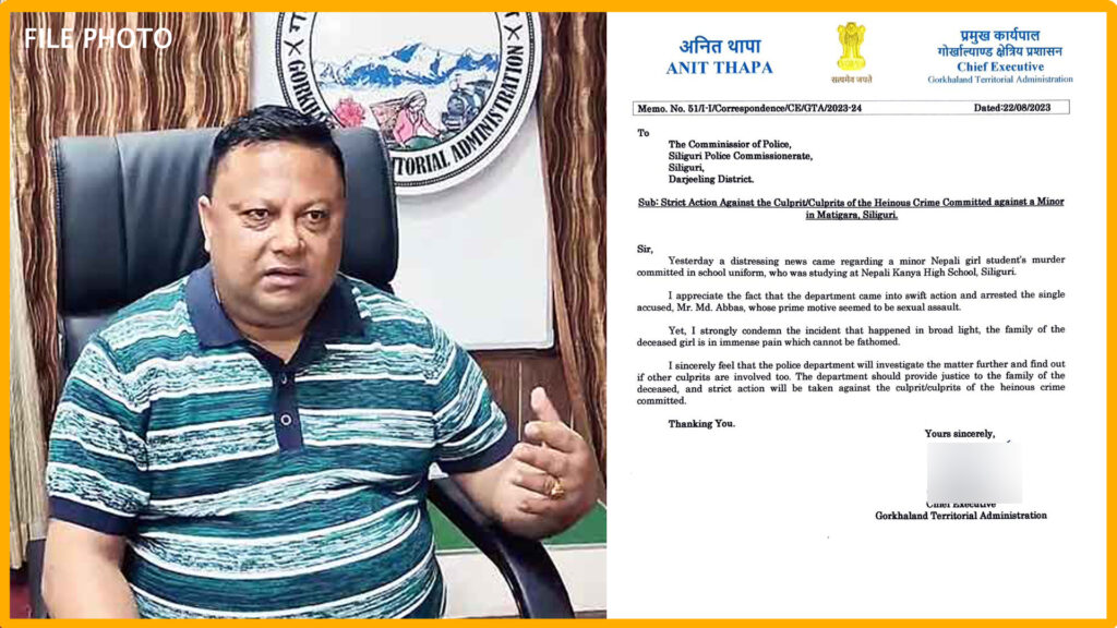 Darjeeling, 22nd August: Gorkhaland Territorial Administration (GTA) Chief Executive, Anit Thapa, vehemently denounced the heinous killing of a minor student enrolled at Nepali Higher Secondary School in Siliguri. In response to this distressing incident, he personally addressed a letter to the Police Commissioner of Siliguri Police Commissionerate. Additionally, he released an official statement, firmly urging for a thorough investigation into the matter and advocating for justice to be delivered to the bereaved family.