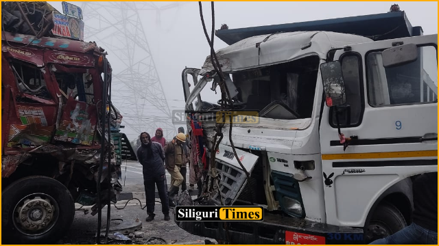 Jalpaiguri, 08th January: A head-on collision occurred on Thursday morning when a dumper truck and a lorry crashed on the national highway near the Paharpur More area in Jalpaiguri. Both drivers were critically injured in the impact.