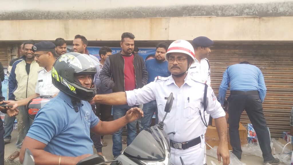 Siliguri, 31st January: On the final day of Road Safety Week, the Bhakti Nagar Traffic Division of Siliguri distributed helmets to individuals riding without them on the Eastern Bypass.