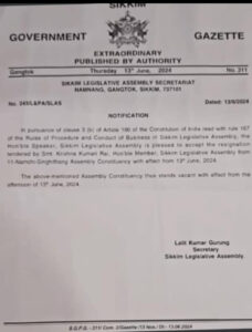 Sikkim, 13th June: Krishna Kumari Rai, the spouse of Chief Minister Prem Singh Tamang, has resigned from her position as Member of the Legislative Assembly (MLA) representing the 11-Namchi-Singithang Constituency, just a day after being sworn in as a legislator. The Speaker of the Sikkim State Legislative Assembly, MN Sherpa, has accepted her resignation, resulting in the Namchi-Singithang Constituency now being vacant.