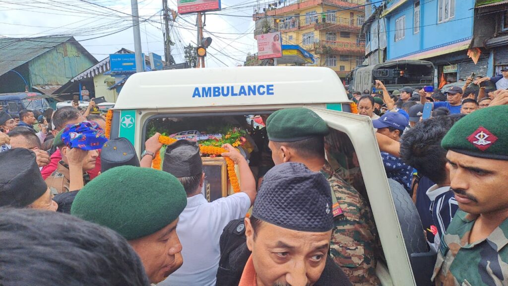 Kurseong, 18th July: On Thursday, Kurseong came together in solemn remembrance as the mortal remains of Captain Brijesh Thapa, a brave son of Gorkha who sacrificed his life for the nation, were brought to the town with military tribute. Subsequently, the final rites of martyr Brijesh Thapa were conducted in Darjeeling’s Lebong