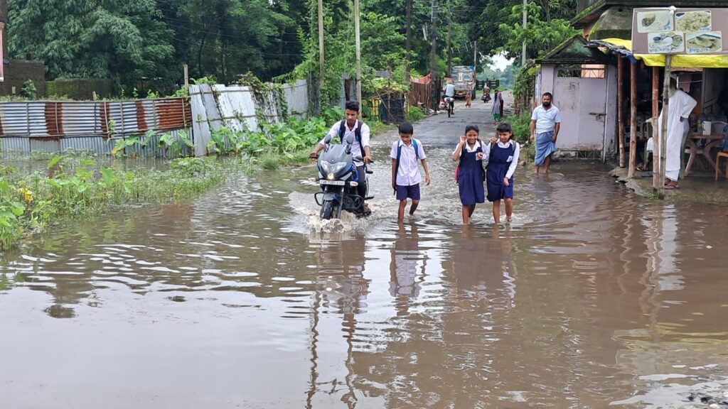 Fulbari, 11th July: Water accumulation on the streets due to a lack of a proper drainage system is causing significant trouble for locals and school students in the Jotiakali area of Fulbari II Gram Panchayat. The condition of the road opposite Fulbari High School has been deteriorating for a long time, making it difficult for pedestrians, especially during the monsoon season.