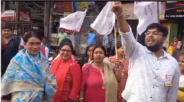As the Trinamool Mahila Congress rally progressed along Hill Cart Road, members and supporters of the Left Youth Students Organization formed lines along the roadside. They vocalized their disapproval by loudly shouting slogans referring to alleged corruption.