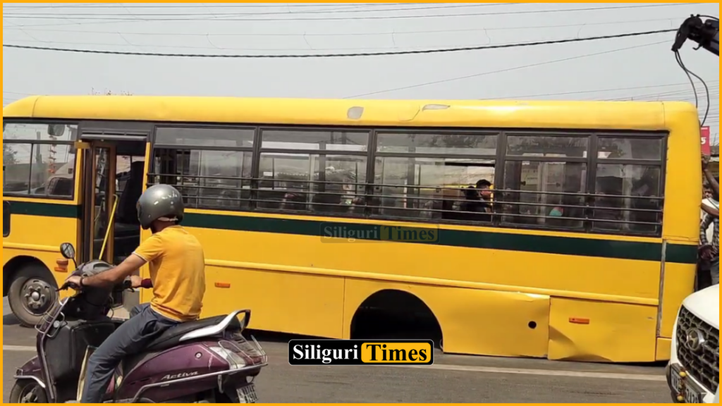 Siliguri, 01st April: A major accident was narrowly avoided in Siliguri on Tuesday morning when the rear wheels of a moving school bus detached. Shocked by the sudden incident, no harm was caused to the passengers. The bus was carrying school students at the time of the accident, which took place near Jalpai More.