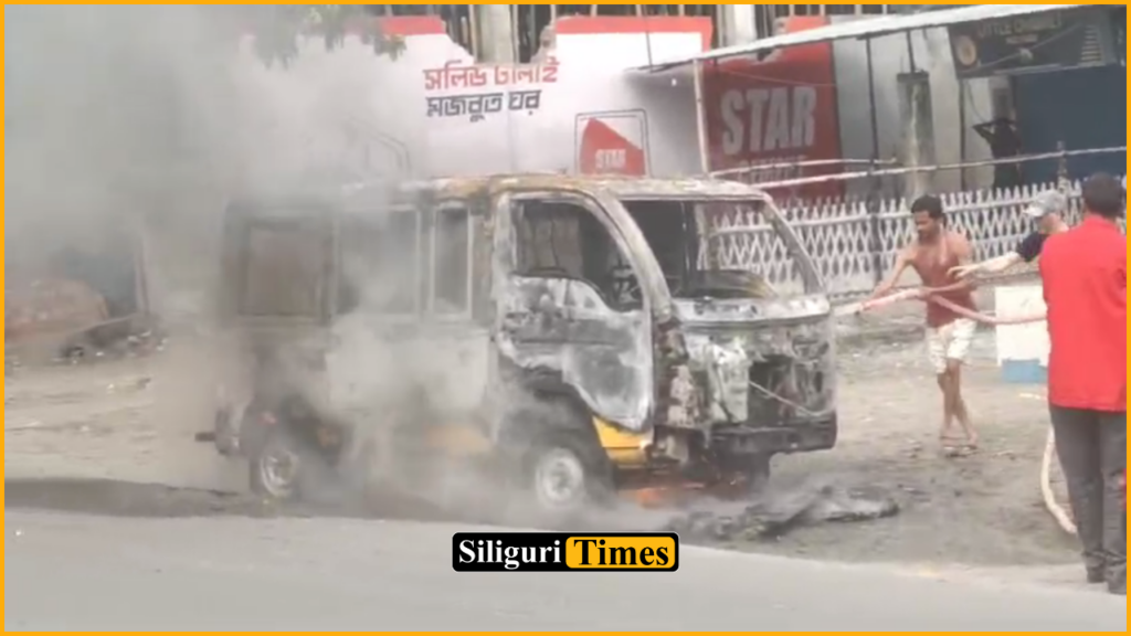 Siliguri, 11th March: A mini van transporting school children caught fire in Siliguri, creating panic in the area. Significantly, due to the driver’s quick thinking, all the children narrowly escaped unhurt. Following the incident, parents have accused the school management of negligence.