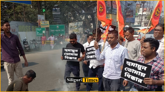 Siliguri, 17th February: The Bangiya Hindu Samaj staged a protest in Siliguri over the naming of a mosque after Babur. The demonstration took place on Tuesday afternoon at Thakur Panchanan Barma Chowk in Siliguri.