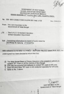 The RTI questioned for relevant details regarding the authority of the GTA to conduct the TET exam. In response, the Joint Secretary to the Govt of WB, School Education Department stated that the GTA was not accorded with any authority to conduct the TET exam.