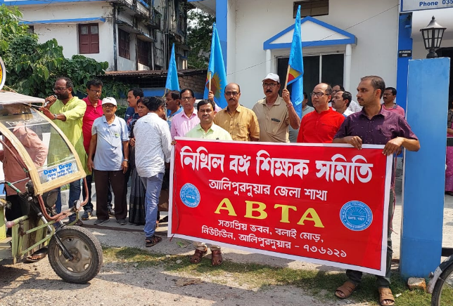 Alipurduar, 23rd April: Nikhil Banga Shikshak Samiti took to the streets in Alipurduar and staged a protest rally and ‘Patha Sabha’ at Alipurduar College Halt against the Calcutta High Court verdict on Tuesday.