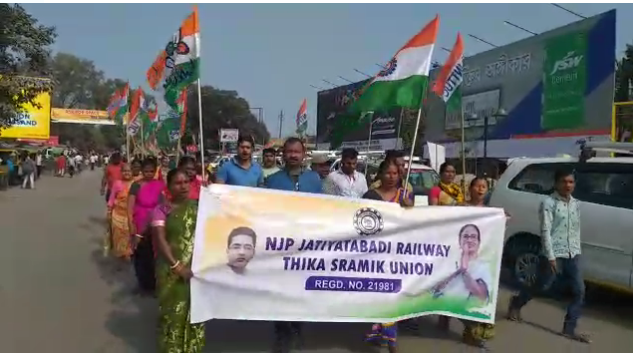 Today a protest rally was taken out by the organization. Sujay Sarkar, president of the NJP branch of the labour organization, said that the central government has taken the initiative to make a model NJP of which the work has also commenced. However, the allottee company has been hiring outsourced contract workers instead of hiring local contract workers. They demanded that locals should be appointed for the work at the earliest.