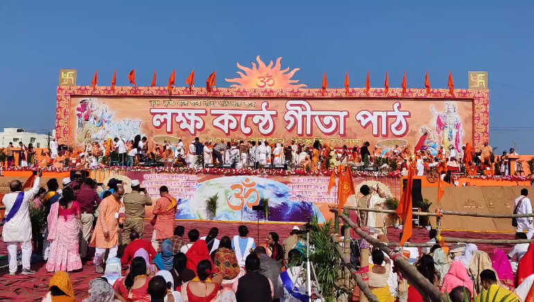 Siliguri, 15th December: A grand event of Mass Gita Chanting was organized at Kawakhali Kurukshetra Maidan in Siliguri today. The event saw the participation of over 1,100 prominent saints and spiritual leaders from across India, who gathered to chant the sacred verses of the Bhagavad Gita in unison.