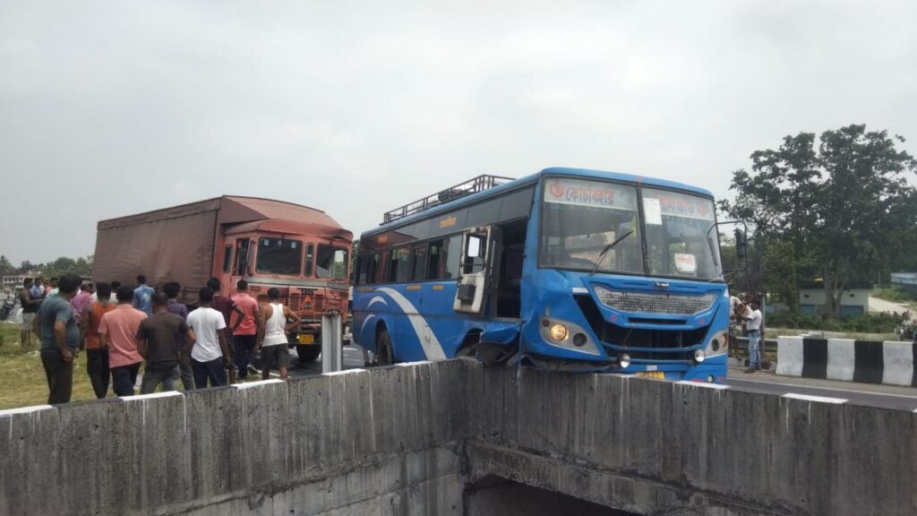 Rajganj, 13th June: A passenger bus met with an accident in the Talma area adjacent to the Siliguri-Jalpaiguri National Highway after losing control and colliding with a cargo container. The bus veered off the road and climbed over the guardrail of a culvert.