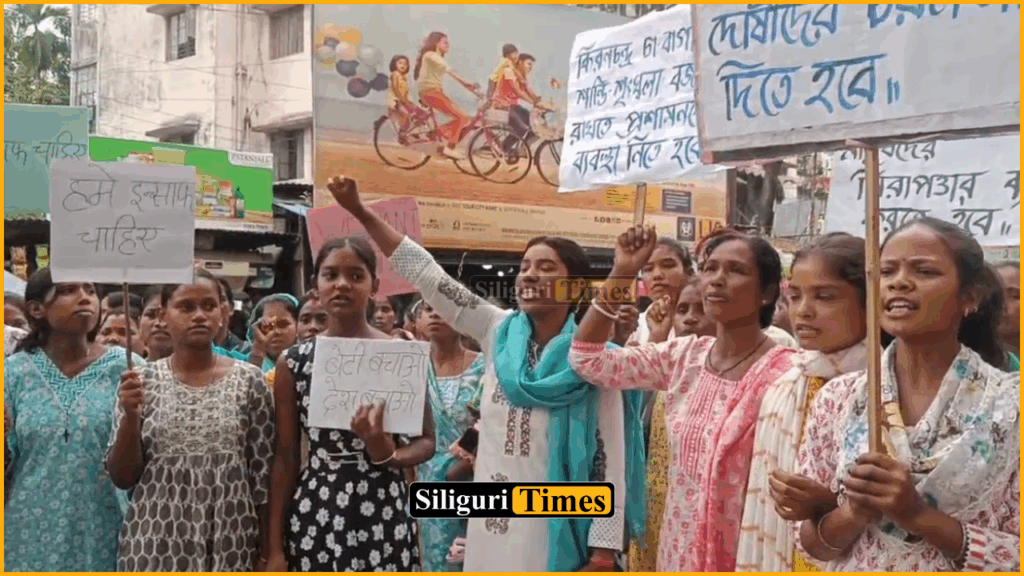 Naxalbari, 28th April: CPI(M) workers and plantation workers staged a protest at the Naxalbari police station, demanding strict punishment for those responsible for the gang rape of a minor girl in Naxalbari. The incident allegedly took place on the night of 20th April at the Kiranchandra Tea Estate in Naxalbari.