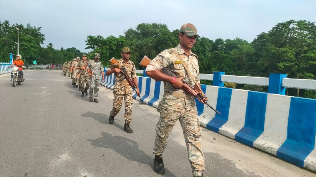In this regard, today, under the leadership of Circle Inspector (IC) Pankaj Sarkar of Rajganj Police Station, a route march was undertaken from Rajganj Market to Kalinagar More. According to reports, during the route march, the IC interacted with the locals.