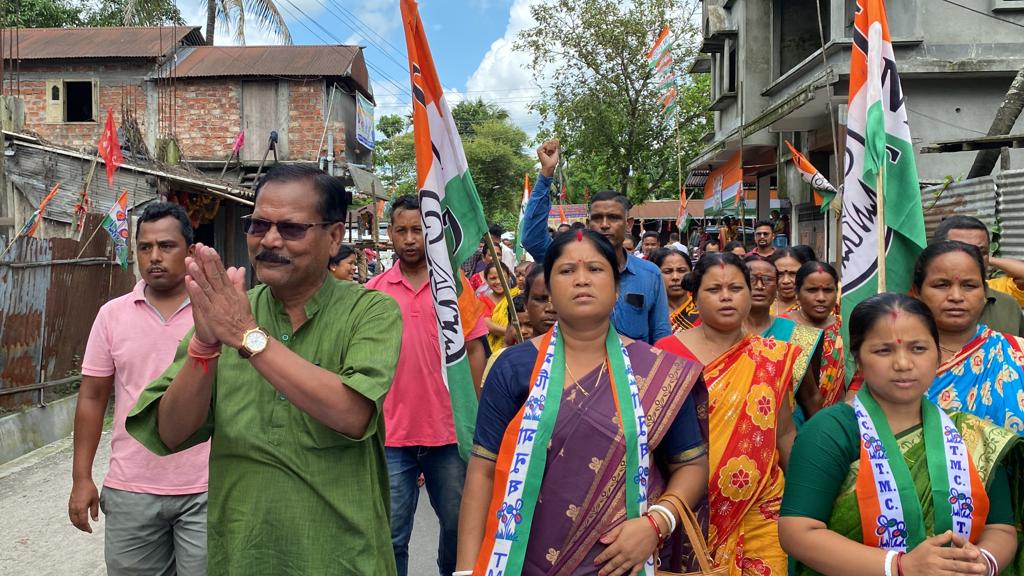 Rajganj, 01st July: Rajganj MLA Khageswar Roy fervently campaigned in support of Trinamool Congress candidates today, leading a rally with hundreds of party workers and supporters at Bhelki Para in Binnaguri Gram Panchayat. During the event, Roy extended his support to Trinamool Congress Zilla Parishad candidate Ranbir Majumdar for Seat No. 13, Binnaguri Panchayat Samiti candidate Sabita Roy, and Bhelki Para booth panchayat candidate Alomathi Barman.