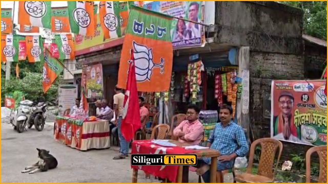 Rajganj, 23rd April: A unique scene of peaceful voting was witnessed in Ambari Business Colony under Rajganj Assembly constituency, where camps of Trinamool Congress, BJP and CPM were set up side by side at the same location.